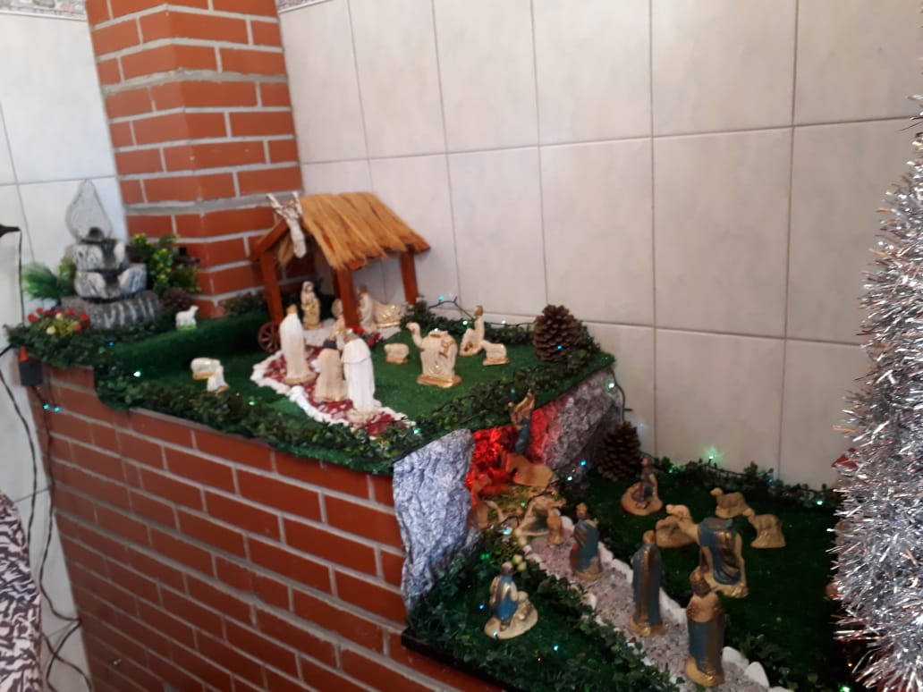 Guirlanda de frutas e laços proxima à mesa da ceia, mais um festão e luz de led vermelha e duas bolas para as pontas do festão